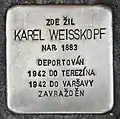 KAREL WEISSKOPF BORN 1883 DEPORTED 1942 TO THERESIENSTADT 1942 TO WARSAW MURDERED | Hejmanské hráze 11 48°57′33″N 14°56′00″E / 48.95928500000001°N 14.93334630000004°E |