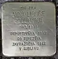 Ema Libuše Pollaková was born on 11 May 1900. Her last residence before deportation was in Tišnov. On 4 April 1942, Ema Libuše Pollaková was arrested and deported from Brno to Theresienstadt concentration camp by transport Ah, together with Alfred Pollak, his wife Helena und their two little daughters. Her transport number was 271 of 1,001. There, after two weeks, on 18 April 1942, Ema Libuše Pollaková was separated from Alfred Pollak and his family. She was deported to Rejowiec, Lublin Voivodeship by transport Ap. Her transport number was 454 of 1,000. There she perished.[20][21]