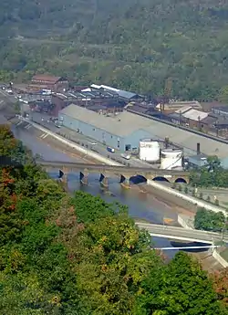 The Stone Bridge spans the Conemaugh River in Johnstown, Pennsylvania. The bridge is a seven-arch stone railroad bridge located on the Norfolk Southern Railway's Pittsburgh Line, built by the Pennsylvania Railroad in 1887–88. Its upstream face was reinforced with concrete in 1929.[1]