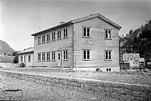 Like the other stations along the Sørlandet Line, the station building received a standardized design. It was built in the overall Neoclassical architecture style adapted in the 1920s. By the 1940s the designs had been altered to include elements of Functionalism.[2] The station building, designed by Gudmund Hoel, was identical to the one at Audnedal Station. The 180 square meters (1,900 sq ft) building is wooden with a concrete foundation. It has siding in wood and a gable roof. The building consists of a main section, where the lower story originally featured a ticketing and waiting room, and an upper story with the station master's residence. The annex was allocated cargo handling.[3]