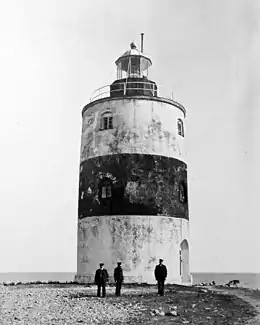 In 1838, a lighthouse with a light height of 27.5 meters above sea level was built on Storjungfrun. The lighthouse consists of a white, round, about 21.3 meter high stone tower with a black belt at the top under the lantern. It formerly also had a red middle belt. Since January 25, 1935, the lighthouse has been a listed building.[2]
