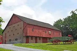 Also located on the property are a contributing brick beehive oven, a brick end bank barn that was built in 1849 and rebuilt in 1876 after a fire, a frame wagon shed, and a metal "Stover Wind Engine".