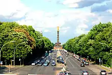 The Straße des 17. Juni (German pronunciation: [ˈʃtʁaːsə dɛs ˈziːpˌt͡seːntn̩ ˈjuːni] , ⓘEnglish: 17th of June Street), is a street in central Berlin, the capital of Germany. Its name refers to the 17 June 1953 uprising in East Germany. It is the western continuation of the boulevard Unter den Linden. It runs east–west through the Tiergarten, a large park to the west of the city centre. At the eastern end of the street is the Brandenburg Gate and the Platz des 18. März, it then passes the Soviet War Memorial before passing either side of Victory Column (Siegessäule) in the middle of the park, and out of the park through the Charlottenburg Gate, terminating about half a kilometre later at Ernst-Reuter-Platz. The street is a section of the main western thoroughfare radiating out from the centre of Berlin so the road continues to the west of Ernst-Reuter-Platz, the first section of which is called Bismarckstraße.