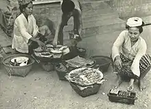 The influences of Chinese street food culture is also visible in Indonesia as early as Dutch colonial era. Numbers of Chinese origin dishes such as various noodles, bakso meatballs, lumpia spring rolls, dumplings and Chinese steamed buns (bakpao) are common in Indonesian urban areas.[10] Numbers of local Indonesian dishes has also become the source of street food variants, as well as foreign influences. Satay for example, is believed started as a street food in the early 19th century, as a local Javanese adaptation of Indian kebabs.[11][12][13] On the other hand, Dutch influence is also visible in Indonesian street food scene, especially in cakes, pastry and cookies. School kids' favourite kue cubit for example, is a local derivation of Dutch poffertjes.