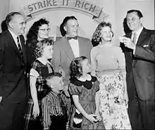 Strike It Rich is a game show that was broadcast on American radio from June 29, 1947 to December 27, 1957, on CBS and NBC.[1] It was broadcast on television as well, starting in 1951. People in need of money (such as for medical treatment or a destitute family) appeared and told their tale of woe, then tried to win money by answering four questions. If the contestant did not win any money, the emcee opened the "Heart Line", which was a phone line to viewers who wished to donate to the contestant's family.[2]