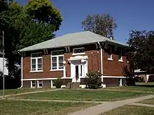 Stromsburg was settled early in Nebraska history. A group of Swedish settlers from the town of Ockelbo arrived in the 1860s after several years in Illinois. This group was led by Lewis Headstrom, who was a real estate agent. Seeing some similarities to their old Swedish homeland the settlers formed what would be called Stromsburg, named after a section of Ockelbo, Sweden.[5] By the 1880s two brickyards were in operation in the town. Many buildings constructed of ‘native’ brick still stand, including the Viking Center, now a community center that was originally The Opera House; the Cornerstone Bank; two businesses on the east side of the square; and several homes. Brick streets still surround the city square in Stromsburg. A brick Carnegie library was built in Stromsburg in 1918. The downtown area of Stromsburg has a town square in its center. This square forms a park, with lawns and mature trees, where festivals and events are held. In the center of the square is a two-story Swedish style building made of brick with decorative toll painting and the phrase "Välkommen" (Swedish for "Welcome").