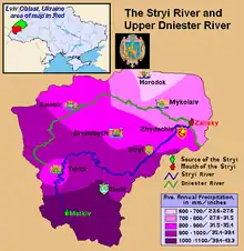![]() Map of the Stryi River with Raion Administrative cities indicated by their respective coats of arms | |