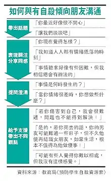 - ↑ 教育局 (October 2010). "預防學生自殺資源套" (PDF): 29. Archived from the original (PDF) on 8 September 2020. Retrieved 26 November 2017.