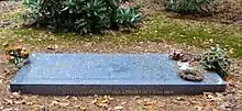 The new grave (in plot 117) remained unmarked for over twenty years. It was acquired in the 1980s by René Weis and Audrey Russell, who had interviewed Avis Graydon (Edith Thompson's surviving sister) at length in the 1970s. On 13 November 1993, a grey granite memorial was placed on plot 117 and dedicated to the memory of the four women buried there. The grave and plot were formally consecrated by the Reverend Barry Arscott of St. Barnabas, Manor Park, the church in which Edith Thompson was married in January 1916.[11] Edith Thompson's details appear prominently on the face of the tombstone, together with her epitaph: "Sleep on Beloved. Her death was a legal formality". The names of the other three women are inscribed around the edges of the tombstone.[12]