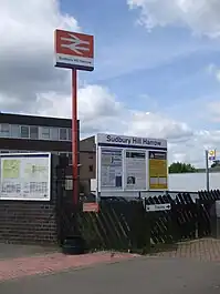 - Signage on eastbound platform, indicating proximity to Sudbury Hill Underground station