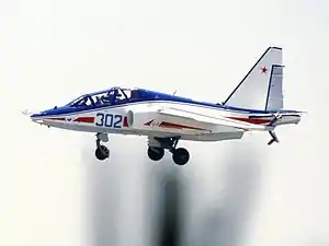 Early variants included the Su-25UB two-seat trainer, the Su-25BM for target-towing, and the Su-25K for export customers. Some aircraft were upgraded to the Su-25SM standard in 2012. The Su-25T and the Su-25TM (also known as the Su-39) were further developments, not produced in significant numbers. The Su-25, and the Su-34, were the only armoured, fixed-wing aircraft in production in 2007.[1] Su-25s are in service with Russia, other CIS members, and export customers. Production of the Su-25 ended in 2017 in Russia[2] and 2010 in Georgia.[3] Attempts continue to be made to restart production in Georgia using partially completed airframes,[4] but as of June 2022 no new deliveries have been reported.