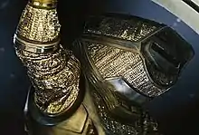 The gold-leaf shielding in Sunshine was influenced by NASA satellite designs for deflecting heat and other forms of radiant energy. Boyle designed the gold-coloured space suits along these lines despite persistent encouragement to model them after the NASA template. The helmets were designed to have cameras mounted in them. This further enhanced a sense of claustrophobia useful to the actors in delivering more heartfelt performances.[32] The helmets were also limited to a horizontal slit for visibility instead of a full-face visor as further consideration toward protecting the characters from the ambient radiation of outer space.[41] According to Boyle, the funnel shape of the helmet was influenced by the character Kenny from South Park.[32]