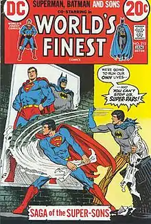 The Super-Sons are a pair of fictional characters appearing in American comic books published by DC Comics. The characters were created by Bob Haney and Dick Dillin and first appeared in World's Finest Comics #215 (January 1973).[1] The characters were featured in stories about the sons of Superman and Batman.[2]