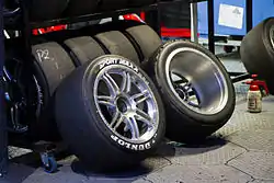 The cars use 18 inches (460 mm) control wheels, produced by Rimstock and supplied by Racer Industries, and control tyres from Dunlop. Supercars are provided with Soft, Supersoft, and Hard slick tyres as well as grooved wet tyres for each event, The requirement to use varying compounds and how many tyres need to be changed per race are dependent on the event[79]