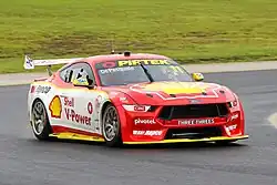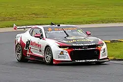 The vehicles used in the series are loosely based on road-going cars. Cars are custom made using a control chassis, with only certain body panels being common between the road cars and race cars. To ensure parity between each make of car, many control components are used. All cars currently use either a 5.4L or 5.7L Naturally aspirated V8 engine. Originally only for Ford Falcons and Holden Commodores, the new generation V8 Supercar regulations, introduced in 2013, opened up the series to more manufacturers.[9] Nissan were the first new manufacturer to commit to the series with four Nissan Altima L33s[10] followed briefly by Erebus Motorsport with Mercedes-Benz E63 AMGs[11] and Garry Rogers Motorsport with Volvo S60s.[12] The series returned to a Ford and Holden duopoly in 2020 with the departure of Nissan, while Ford replaced the Falcon with the Mustang in 2019.[13] Holden announced its final year of competition in 2022, to be replaced by the Chevrolet Camaro ZL1 for the 2023 season.[14][15]