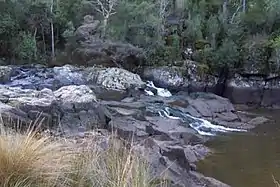 The river rises below Kellys Lookout within the Mount Careless Forest Reserve, southwest of Beaconsfield and west of Exeter. The river flows generally east-northeast, joined by two minor tributaries before reaching its confluence with the Tamar River at Robigana. From this point, the river enters the Bass Strait. The river descends 416 metres (1,365 ft) over its 27-kilometre (17 mi) course.[1] The river is transversed by the West Tamar Highway.
