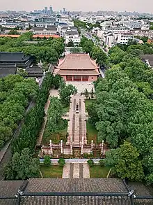 Suzhou Confucian Temple is located in the central part of Suzhou, Jiangsu province, China. Built by the order of Fan Zhongyan, then the Prefect of Suzhou, it stands across from the street with Garden of Surging Wave Pavilion.[2] In 1035, Fan Zhongyan was the Prefect of Suzhou. He combined the State School and the Confucian Temple, which began the State education. The system was imitated by other places, for which it got the saying "State education began from Wu County".[3] Suzhou Temple School had been extended several times, so presently, it takes up a large area. According to the record of County Wu, it had 213 rooms during the Southern Song dynasty (in 1241). In its day, it had classrooms, dormitoroes, exam rooms and canteens, besides the hall and temple. Suzhou Temple School also had gardening architecture, for instance, rockery, pond, bridge and pavilion. Its scale is the biggest among schools in the southeast.
