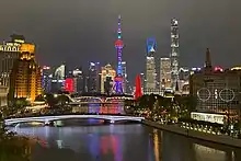 The Wusong River acquired its modern name in the mid-19th century: because it connected Shanghai with Suzhou, it was called "Soochow Creek" in English, and the popular Chinese name was a back translation from the English.[5] The first documented mention of "Soochow Creek" occurred in the 1848 version of the Shanghai Land Regulations, the rules which governed the foreign concessions of Shanghai. From there, the name entered popular parlance, and "Suzhou Creek" is now the predominant name used in Shanghai.[6][7] However, "Wusong Creek" remains in use in some official contexts and is the name used by upstream residents closer to Suzhou.[8]