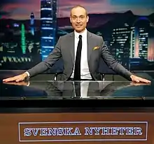 Svenska nyheter (Swedish for Swedish News) is a Swedish weekly satirical comedy programme broadcast on SVT1, making fun of that week's latest news stories. The show was hosted by comedian Jesper Rönndahl during season 1 to 3 (2018 – 2019; there are two seasons per year).[1] Kristoffer Appelquist was the host[2] season 4 to 10 (2019 – 2022). Messiah Hallberg is the new host beginning with season 11 (2023).