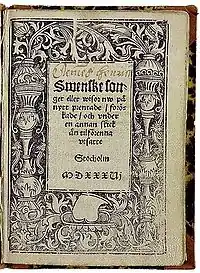 Swenske songer eller wisor nw på nytt prentade / forökade / och under en annan skick än tilförenna utsatte, often abbreviated as just Swenske songer eller wisor 1536, is the first preserved hymnal published in the Swedish language and was released in 1536.[1] It consists of 47 songs or hymns,[2] all of which have been issued anonymously.[1] Olaus Petri, a major contributor to the Protestant Reformation in Sweden, is however believed to have authored most of them, with contributions from Ericus Olai and Laurentius Petri.[1] A large amount are translations of Latin and German hymns.[1]