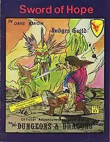 Sword of Hope was written by Dave Emigh, and was published by Judges Guild in 1980 as a 32-page book.[1] Although approved for D&D, the cover was printed as approved for AD&D; when distributed, "Advanced" was covered by a Judges Guild sticker.[1]