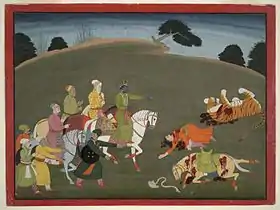Now, there was a rumour that Krishna also had his eye on the Syamantaka jewel, and when the incident of Prasena's mysterious disappearance became public, the people accused Krishna of murder and theft. In order to prove his innocence, Krishna sought to find out the true culprit and recover the jewel. As he followed on the trail of the deceased Prasena, he came to the spot where the corpses of Prasena and his horse still lay, along with pieces of teeth and nails of a lion. From there he followed the footsteps of the lion, which led him to the spot of the second struggle, where the corpse of the lion was lying. From there, he followed the tracks of a bear, which finally led him to the entrance of Jambavan's cave, where the latter's children were playing with the priceless jewel. Thereafter, he engaged in furious, protracted combat with Jambavan for 28 days, and Jambavan gradually grew tired. As he was the strongest living entity at that time, he wondered who could be weakening him. It was then that Jambavan realised that he had been sparring with none other than Rama himself. Jambavan, who was hot-headed, but pious by nature, returned the jewel to Krishna, and also granted him the hand of his daughter in marriage, called Jambavati.[9]