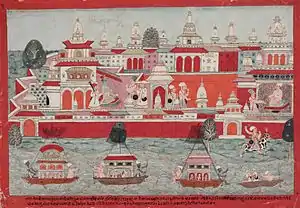 One day, Satrajita, a Yadava nobleman, and a devotee of Surya, the solar deity, was walking along the sea shore, praying ardently, when the god himself appeared before him. Seeing the god in an indistinct and fiery shape, Satrajita asked him to appear in a less blinding form, so that he could see him clearly. For this, the sun god took the Syamantaka jewel off his neck, and Satrajita saw him possessing a dwarfish stature, with a body like burnished copper, and with slightly reddish eyes. Having offered his adorations, the sun god offered him a boon, and he asked for the jewel. When Satrajita returned to Dvaraka with the jewel, people mistook him for the sun god, such was his dazzling glory that even Krishna asked him to present the jewel to Ugrasena, the supreme leader of the Yadavas, but Satrajita did not comply.[7]