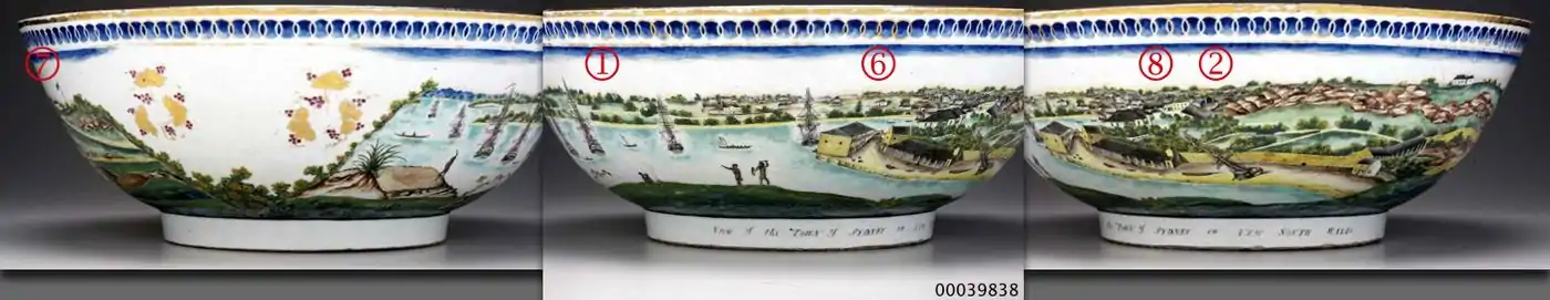 - 1 2 "Chinese export ware punchbowl featuring a scene of Sydney Cove before 1820: manuscripts catalogue". State Library of New South Wales.