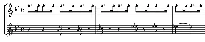 The second theme in B♭ major features dotted repeated notes in a solo oboe against jerky acciaccaturas in the first violins. This is the "Hen" motif that gives the symphony its nickname, although it is also related to the dotted rhythm response in the first theme.[3] The development features the exploration of the two themes in different keys. It opens with the first theme in C minor, followed by the second theme in E♭ major and F minor. The first theme is then heard contrapuntally leading towards the dominant allowing for a retransition to the tonic for the recapitulation. The first theme is recapitulated in G minor while the second theme is recapitulated in G major.[3]