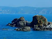 The reef is divided into four rocks above water which, however, are joined below; it is separated from the continent by a narrow channel filled with many stones, by which as by a staircase one can cross the channel with dry feet when the sea is calm; but when the sea is rough, waves surround the four rocks into which I said the reef is divided. Three of these are low and more or less submerged, but the middle one is higher than the European rock, sloping up to an acute point and roundish right up to its summit; it is splashed by the waves but not submerged and is everywhere precipitous and straight.[2]