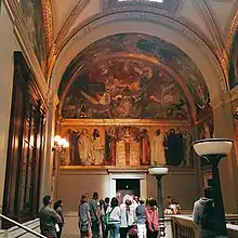 Synagogue is an allegorical mural by John Singer Sargent in the Boston Public Library.[1] It is part of Sargent's larger Triumph of Religion mural cycle in the library's central branch at Copley Square. Synagogue was unveiled in 1919, and it sparked immediate controversy.[2] The cowering and feeble personification of the Synagogue stood in contrast with Sargent's glorified depiction of the Church in the mural cycle, and members of the Jewish community observed that the series delivered an implicit message of Jewish decline and Christian triumph.[2] Sargent was reluctant to respond publicly to criticism of the work, but privately wrote in 1919, "I am in hot water with the Jews, who resent my ‘Synagogue,’ and want to have it removed– and tomorrow a ‘prominent’ member of the Jewish colony is coming to bully me about it and ask me to explain myself. I can only refer him to Rheims, Notre Dame, Strasbourg and other Cathedrals, and dwell at length about the good old times."[2]: 233 Responding to charges that the work was antisemitic, the Massachusetts legislature passed a bill ordering the removal of the mural in 1922, but the law was soon repealed, and the work has remained in place.[2]: 236