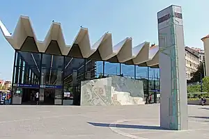 The station is accessed by a building in the centre of the square, the exterior of which is strikingly similar to that of Saint Petersburg's Pionerskaya Station. Within this building, escalators descend directly from street level to platform level. At the foot of the escalators is a concourse, which gives access to platform faces on either side, forming a single island platform.