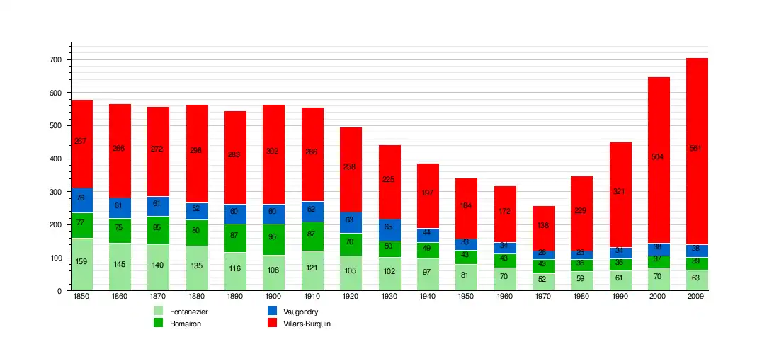 Before 2011, Tévenon, a municipality that is also known as "Pied-de-la-Côte", was made up of 4 different municipalities: Villars-Burquin, Vaugondry, Romairon, and Fontanezier. Romairon and Fontanezier were first mentioned in the 15th century.[4] In 1897, a church was built in Villars-Burquin and a parish was created in the four municipalities in order to bring their populations closer together. Vaugondry and Villars-Burquin were both part of larger places but separated respectively from a lordship in Grandson, Switzerland in 1730 and from "Métralie de Fiez" in 1844 but merged with the other two municipalities, Romairon and Fontanezier in 2011 to form the municipality of Tévenon.