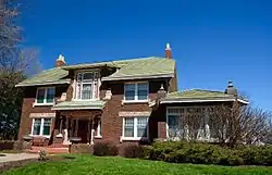 The T. Ben Loetscher House is a historic building located in Dubuque, Iowa, United States. T. Ben and Nellie Loetscher had this house built in 1929. It is one of the best examples of early 20th century period revival eclecticism in the city.[2] It was designed by Dubuque architect C.I. Krajewski. The 2½-story brick house features a main entrance with sidelights and other windows that reaches the attic level. It features a blend of wood carvings in foliate and rope designs, and Bedford stone lintels and blocks that are carved with reliefs that reflect an Italian Renaissance influence. The brick color, chimneys and roof style reflect the Tudor Revival style. The house also has large windows with transom and casements that reflect the Colonial Revival style. A single-story brick addition is located on its southeast side blends into the rest of the house. The house was listed on the National Register of Historic Places in 1989.[1]