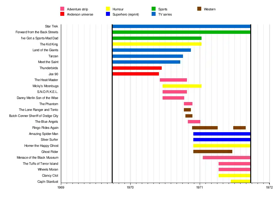 Tarzan | TV series | Don Lawrence | 1 (27 Sep 1969) | 54 (3 October 1970) | Based on the NBC series that ran from 1966 to 1968. Continued from the earlier version of TV21 | |