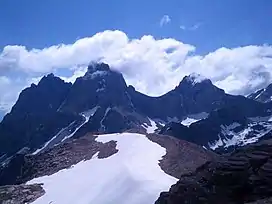 Table Mountain (11,111 feet (3,387 m)) is located in the Teton Range in the U.S. state of Wyoming. The peak is on the border of Grand Teton National Park and the Jedediah Smith Wilderness of Caribou-Targhee National Forest.[3] Table Mountain is west of the south fork of Cascade Canyon and a little more than 1 mile (1.6 km) north of Hurricane Pass.