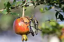 Males stridulate more commonly than females by expanding the hindwings against the closed forewings, thus flashing the bright red hindwings.[3] It is unique among desert grasshoppers in its range because of its conspicuous size and coloring. The body is mostly black, with finely patterned black and yellow forewings with green veins and red hindwings with black borders. The antennae and head of the adult include orange markings.[12] In some parts of Mexico, adults that are mostly yellowish, orangish or greenish (instead of largely black) are regularly encountered, but in the United States they are rare and most frequently seen in Arizona.[7][9] The T. eques nymph essentially lacks wings and has a black-and-yellow coloration that resembles that of the adult.[1] Dark adults and nymphs of Romalea microptera (eastern lubber grasshopper) are similar to and frequently confused with T. eques. Their ranges are not known to overlap but they could potentially come into contact in southern Texas; R. microptera has an eastern distribution in the state and T. eques a western distribution in the state.[2][7]