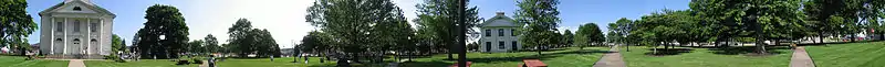 The Circle itself, which surrounds the Historic Church, Old Town Hall, and Circle Park, continues to be a notable landmark at the center of the town. While two separate Ohio state routes meet at the intersection (SR 91 and SR 261; at one point SR 18 and SR 532 also met there), the one-lane circle regularly accommodates several dozen vehicles at a time without congestion, although jams are present on roads leading to the circle itself at peak hours. The eight roads that meet at the Circle form a spoke design (see image, upper right) that, as they lead away from the Circle, travel in the cardinal and ordinal directions. The roads are named according to the respective directions they travel away from the Circle (e.g. Northwest Avenue); these names are not preserved by the neighboring municipalities into which the eight roads run.[8] 4 of these 8 roads comes to a six-point intersection within the original city, forming a square with the 4 corners in the Northeast, Northwest, Southeast and Southwest roads running through them. In summer 2010, one of these six-point intersections in the northeastern portion of Tallmadge was converted to a roundabout based on the design of the original Circle.