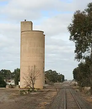 Tallygaroopna is a closed railway station on the Goulburn Valley line, in the township of Tallygaroopna, Victoria, Australia. The station opened at the same time as the railway line from Shepparton to Numurkah on 1 September 1881.[1] The passenger platform was shortened in length from 107.3m to 101.2m in 1973.[2] The siding to the grain silos was lifted at an unknown date.