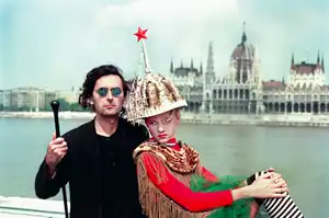 Curator Gyula Musckovics characterized Király's work as anti-political, existing in a parallel realm not directly in opposition to the political one.[35] He was tolerated by the communist authorities despite flouting norms of socialist fashion good taste of the era.[9] Several of his creations employed communist iconography, including a 1987 dress that folded out to resemble the Red Star.[9][36] Such works were additionally infused with queer aesthetics; though Király was married with children, he may have been pansexual.[37] In a 2020 piece, artist Eszter Ágnes Szabó drew attention to Az Emberevő szerelme as being quintessentially "camp", and thus naturally suited to Király's "entire creative career".[5]: 61 Szabó sees its usage of electric blue as one of the "almost mandatory references" to David Bowie, who had a cult status in the Hungarian underground, adding: "Bowie embodied almost everything that was opposed to the Hungarian official culture of the time".[5]: 61, 62 "No one could tell what statement Király was exactly making," Trufelman said of the parliamentary hat of 1989. "Was it a joke? Was it a political protest? Was it quite simply just a cool hat?"[35] By contrast, Reform magazine claimed that the item had been designed as part of a publicity stunt for its independent journalism: "Although Tamás Király claims to be apolitical, he still designed a parliamentary fur hat for Reform".[15]