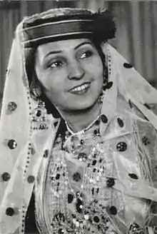 From 1941 to 1969, she was an organizer, artistic director, ballet master, and soloist of the musical ensemble of the Uzbek Philharmonic.[6] She combined her artistic activities with extensive agitational work and took an active part in the movement for the emancipation of Muslim women. During the war years, she actively participated in front-line brigades, gave over 1000 concerts, received the Stalin Prize for her contribution to the defense fund, and donated funds for the construction of airplanes and tanks.[3] In 1944, she performed concerts for Central Asian workers mobilized to work in Chelyabinsk and Molotov regions.[10] She was a member of the Communist Party (Bolshevik) from 1941. She was a deputy of the Supreme Soviet of the Uzbek SSR since 1937 and from 1948.