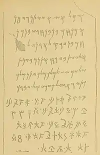 - 1 2 Letter from Professor Wright, 15 December, 1886; in the Proceedings of the Society of Biblical Archaeology: "Among the objects from Cyprus exhibited during the past summer at the Colonial Exhibition were two bilingual inscriptions, Phoenician and Cypriote, the property of Colonel F. Warren, R.A., who discovered them during his excavations at Frangissa... The longer and better preserved of these has been translated and published by the well known archaeologist M. D. Pierides, though without the Phoenician text... The smaller of Colonel Warren's two bilinguals is not nearly so well preserved, especially as regards the upper or Phoenician portion. I have sent a squeeze of it to Professor Euting, who will no doubt succeed in deciphering it with Dr. Deecke's help."