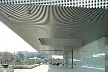 The interior is more neutral, with mostly white surfaces and subdued lighting. The architect describes it as "a frame for the display of art, an empty canvass to be filled with paintings, a beautiful but blank container to be completed by its contents."[7] It includes a gift shop and an indoor/outdoor cafe.