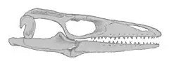 In dorsal view, the skull of Taniwhasaurus is triangular in shape. Like other tylosaurines, the skull of is characterized by the presence of an edentulous rostrum, an anterior process to the dentary bone, and an exclusion of the frontal from the margin of the orbit.[11][1] The snout of T. oweni is rather straight,[1] while in T. antarcticus it is curved. The external nostrils turn out to be curved backwards.[11] The rostrum of Taniwhasaurus has a dorsal crest and the frontal bone has a sagittal keel. The lateral margins of the frontal are straight. The genus also has a quadrate bone with the main diaphysis deviated laterally, as well as a pronounced, ventromedially directed process of the suprastapedial. These features essentially lock the posterior movement of the jaws to the maximum posterior rotation of the quadrate.[9] The premaxilla of Taniwhasaurus bears a longitudinal crest on the anterior half of its dorsal surface, unlike that of Tylosaurus in which the dorsal surface of the premaxilla is smooth. Like other tylosaurines, this process is extremely well developed, extending the equivalent distance of the two tooth bases of the maxillae.[30][20] The ascending process of the maxilla is relatively low and rounded, and the articulation with the prefrontal is a long, gently sloping suture. Thus, the maxilla of Taniwhasaurus is largely excluded from contact with the frontal. The angle described by the descending and horizontal branches of the jugal bone is consistent with the angle observed in mosasaurs of the plioplatecarpine group.[1] The mandible of Taniwhasaurus is characterized for having a slender structure and an unusually high coronoid process.[11][1]