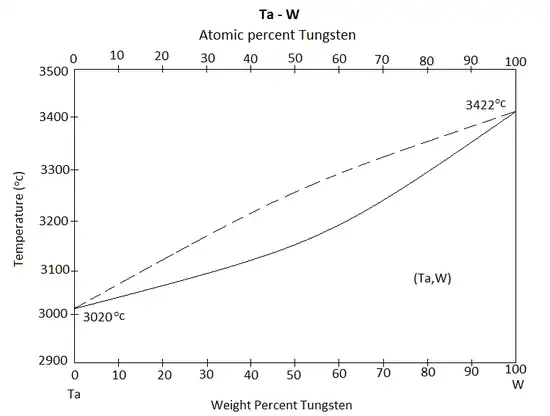 The equilibrium phase diagram of the alloy formed between the two components tantalum and tungsten is a binary diagram, where the two components are totally soluble on each other. In this diagram the melting temperature of the two elements are shown. It can be seen that there are two lines, representing the solidus and liquidus.[3]
