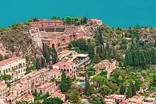 Taormina (UK: /ˌtɑːɔːrˈmiːnə/ TAH-or-MEE-nə,[2] US: /-nɑː/ -nah, also /taʊərˈ-/,[3][4] Italian: [ta.orˈmiːna]; Sicilian: Taurmina) is a comune (municipality) in the Metropolitan City of Messina, on the east coast of the island of Sicily, Italy. Taormina has been a tourist destination since the 19th century. Its beaches on the Ionian sea, including that of Isola Bella, are accessible via an aerial tramway built in 1992, and via highways from Messina in the north and Catania in the south. On 26–27 May 2017 Taormina hosted the 43rd G7 summit.