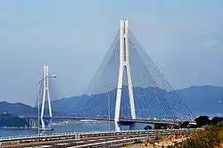 The Tatara Bridge (多々羅大橋, Tatara Ōhashi) is a cable-stayed bridge that is part of the Nishiseto Expressway, commonly known as the Shimanami Kaidō しまなみ海道. The bridge has a center span of 890 metres (2,920 ft). As of 2010, it has the fourth longest main span of any cable-stayed bridge after the Sutong Bridge. The expressway is a series of roads and bridges that is one of the three routes of the Honshū-Shikoku Bridge Project connecting the islands of Honshū and Shikoku across the Seto Inland Sea in Japan. The Kurushima-Kaikyō Bridge is on the same route.