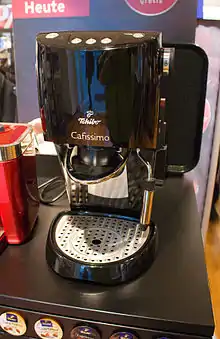 Tchibo is a German chain of coffee retailers and cafés known for its range of non-coffee products that change weekly.[3] The latter includes: clothing, furniture, household items, electronics and electrical appliances. In Germany, Tchibo's slogan is "Every week a new world" (German: Jede Woche eine neue Welt).[4] Tchibo has further expanded its product range to sell services such as travel, insurance, and mobile-phone contracts.
