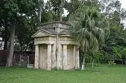 Across the green lawn to the east of the Teacher-Student Centre stands a small Greek Mausoleum. It was constructed in 1915. This building has a square structure, similar to a classical doric monument, with an entrance on the east side, transforming the square plan into a cruciform shape. The flat roof projects forward on all sides. The mausoleum still has several epitaphs attached to the wall,[3] most of which are written in classical Greek. It is the only trace of the small Greek community that existed in Bangladesh in the 19th century.