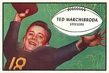 Marchibroda was selected in the first round of 1953 NFL Draft by his hometown Pittsburgh Steelers as the fifth overall pick and the first quarterback selected. After one year, he left the Steelers to serve in the U.S. Army, and returned to the Steelers after his discharge. Marchibroda finished his professional playing career with the Chicago Cardinals in 1957.[3]